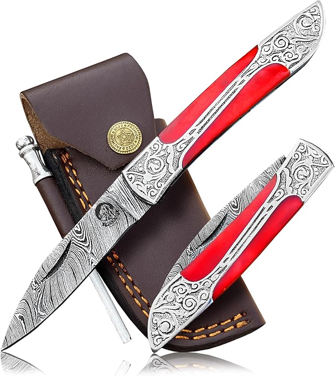 3Pcs Damascus Steel Pocket Knife with Clip and Leather Sheath - EDC Knife for Outdoor and Camping Activities, Handmade Folding Knife, Free knife Sharpner (Vulture Red Eye)