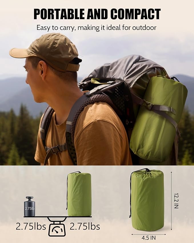 - Compact and Lightweight for On-the-Go Convenience- Our Inflatable Camping Pad is designed for convenience. Easily carried anywhere, its compact folded size of just 4.5×12.2 inches and featherlight weight of only 2.75lb make it a perfect fit for your backpack's side pocket. Enjoy hassle-free and delightful outdoor adventures with ease.