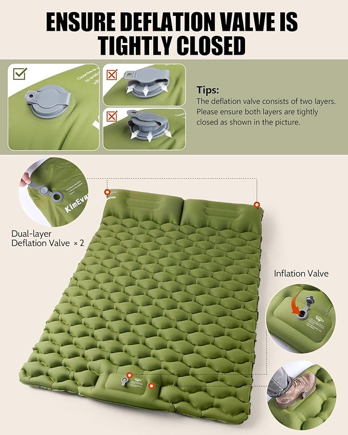 - Quick Inflate and Deflate in Minutes- With our built-in foot pump, you can have your Double Sleeping Pad for Camping fully inflated in just 2-3 minutes. Plus, each of the pillow's ends is equipped with a dual-layer deflation valve, ensuring effortless deflation and hassle-free packing, allowing you to move on with ease.