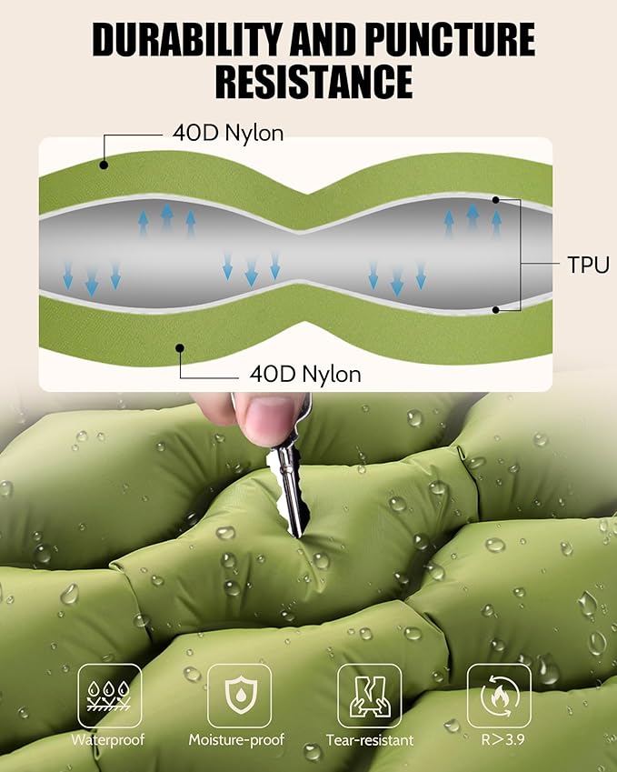- Durable and Weatherproof for Any Adventure- Crafted from high-quality 40D nylon with TPU composite, our Camping Mattress is waterproof, durable, and abrasion-resistant. Whether you're camping, hiking, or backpacking, rest assured that your sleeping pad can withstand the elements.