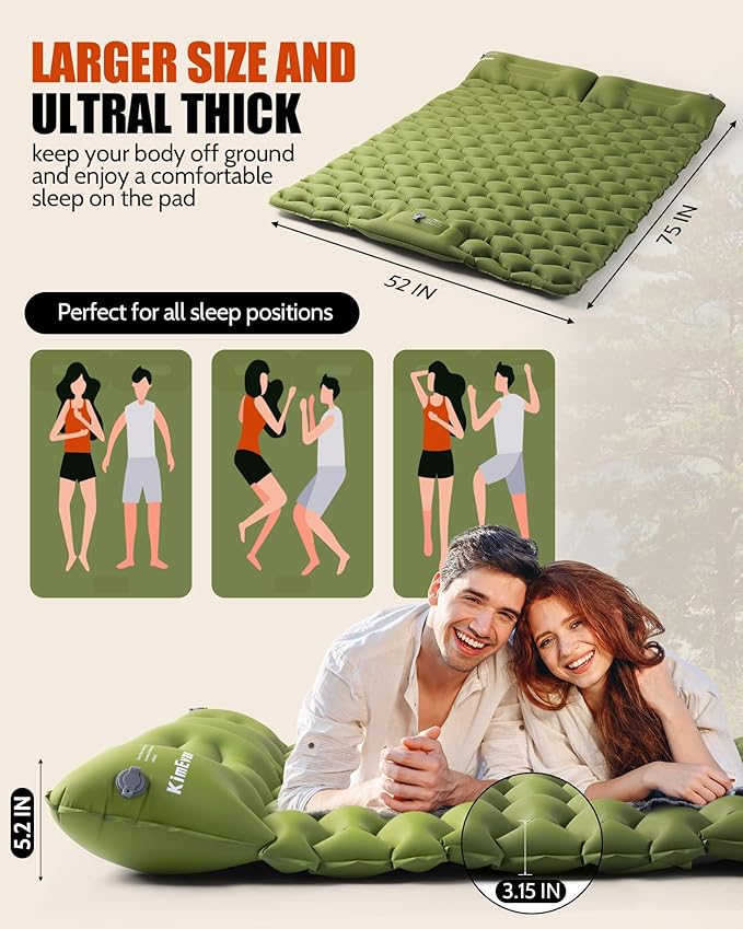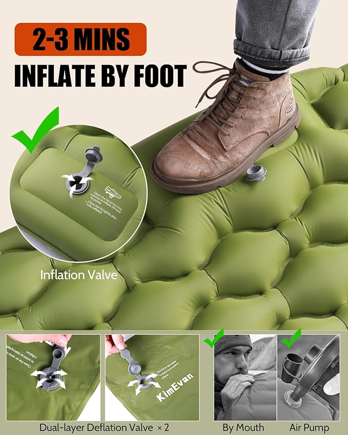 - Complete Set with Peace of Mind! - Each package includes the double sleeping pad, repair patch kit, drawstring storage bag, and user manual. Plus, KimEvan offers a 1-year warranty and professional after-sales service, ensuring your satisfaction. Elevate your outdoor experience today!
