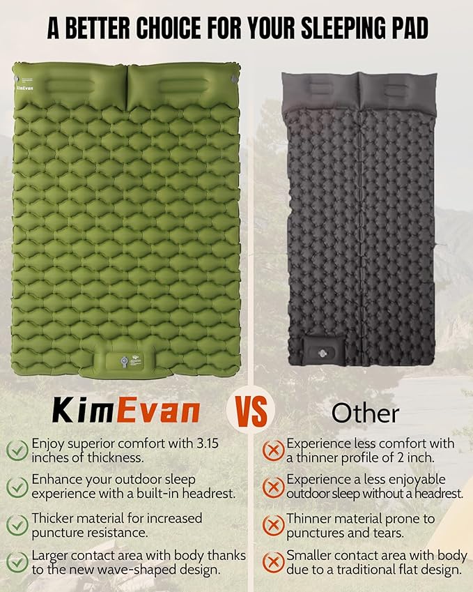 - Wave-Shaped Design for Superior Comfort- Experience unparalleled comfort with KimEvan's innovative Double Sleeping Pad for Camping. The unique wave-shaped design offers 30% more contact area, ensuring optimal support and enhanced comfort for outdoor enthusiasts. Say goodbye to restless nights and hello to refreshing sleep under the stars!