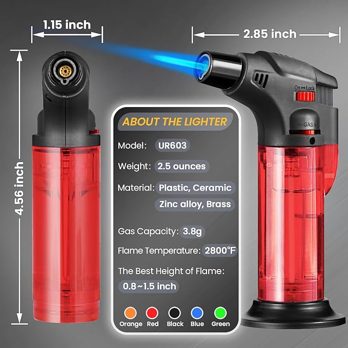 - SUPER VALUE 5 PACK: A set of 5 colorful torch lighters, each lighter comes with a detachable base, for enhanced stability and to prevent accidental drops. LIGHTER WILL BE SHIPPED UNFILLED DUE TO THE TRANSPOTATION RULES
