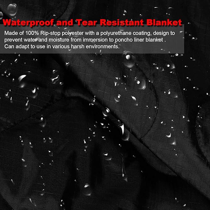 - 【Measurements and Material】Size:this Poncho Liner is approximately 82 1/2 * 60 inches total length and weighs 2.2 pounds.Material:this milittary blanket made of 100% Rip-stop polyester,Ensure a secure and long-lasting usage everyday