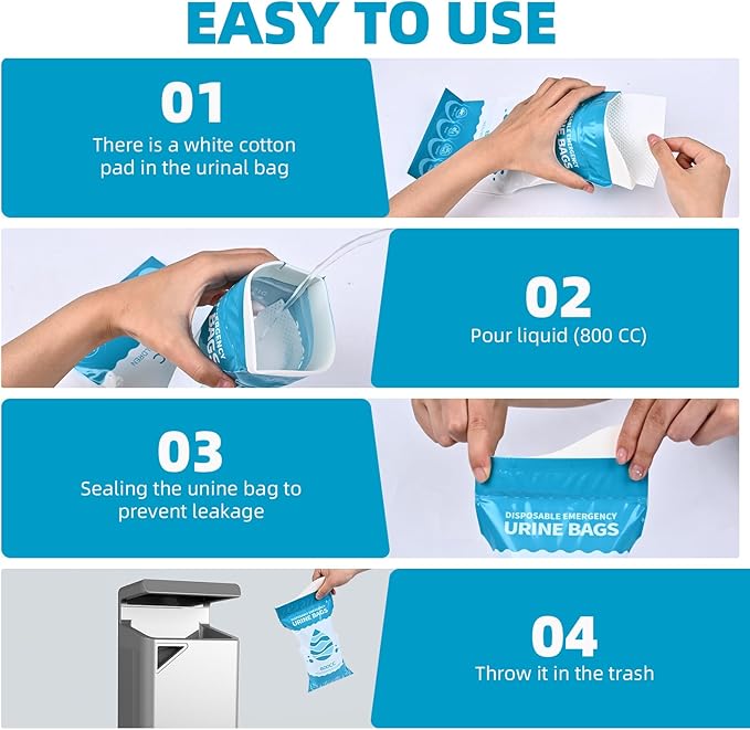 - 【Easy to use】Opening the urination bag, please double-check a white absorbent cotton pad inside it, which can turn urine into an odorless gel within 40 seconds . After using, please seal it and throw urine bag in the trash.