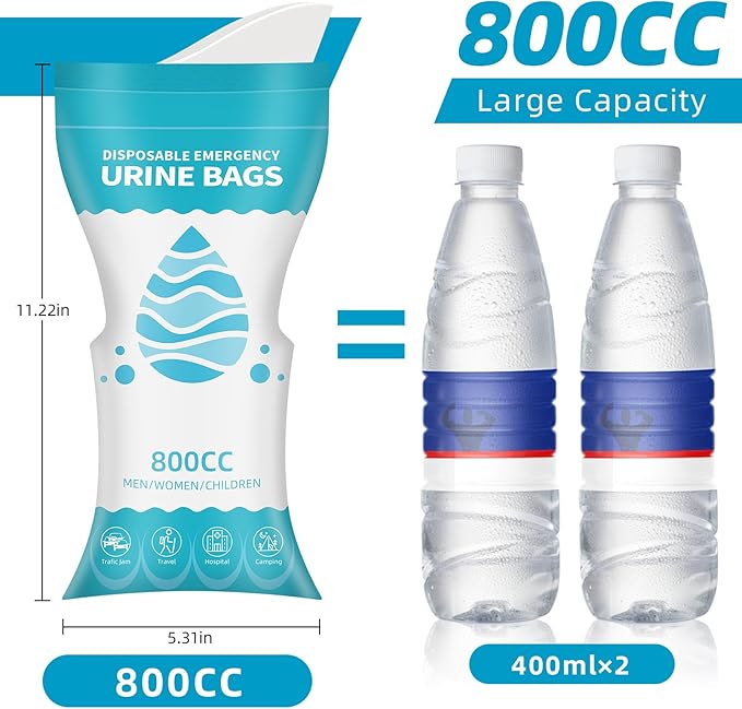 - 【Robust sealing, large capacity】800ml large capacity disposable unisex pee bag, which is ample for all people in emergency since the urine volume of an adult is about 400ml at a time, each packaging bag has a tight sealing pinch strip to prevent leakage,so no need worry about any inconvenience.
