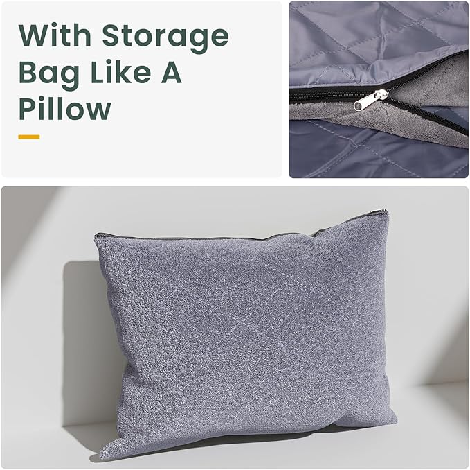 - With A Storage Bag Like A Pillow: This packable camping blanket can be easily rolled up or folded and placed into the storage bag with a zipper, making it convenient to carry and store. The storage bag shaped like a pillow, allowing you to rest your head on top when needed, is perfect for use in the car and during camping. Additionally, this camping quilt is machine washable and easy to maintain.