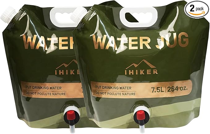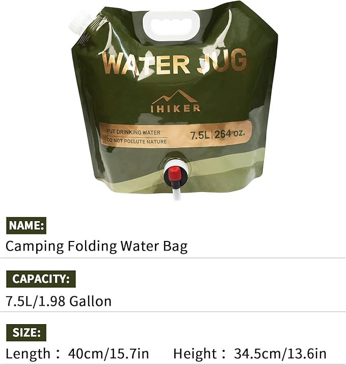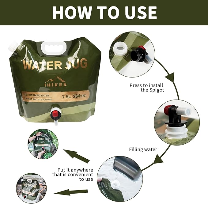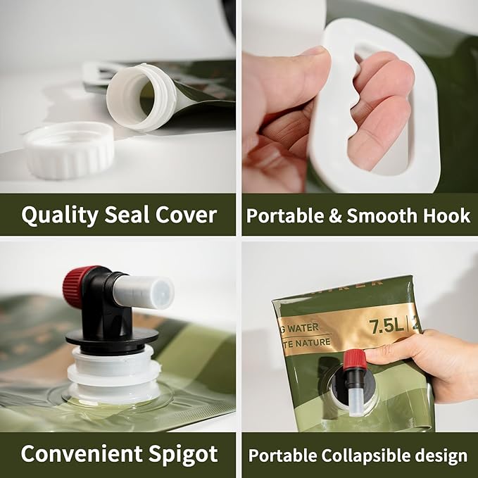 - 1.98 Gallon Capacity & With a Spigot- Camping water container has capacity of 7.5L/1.98 Gallon with a Spigot, filled with water can be placed on the table as a water dispenser. In addition, the emergency water storage can also storage for all your drink and dry goods such as rice,cereal,beans or grains.