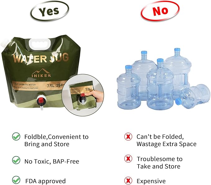 - Portable Water Storage Containers - Portable, lightweight & compact water carrier. Easily folds or stores flat taking up little space. When you need it, the camping water jug can fill 7.5L of water for travel use.