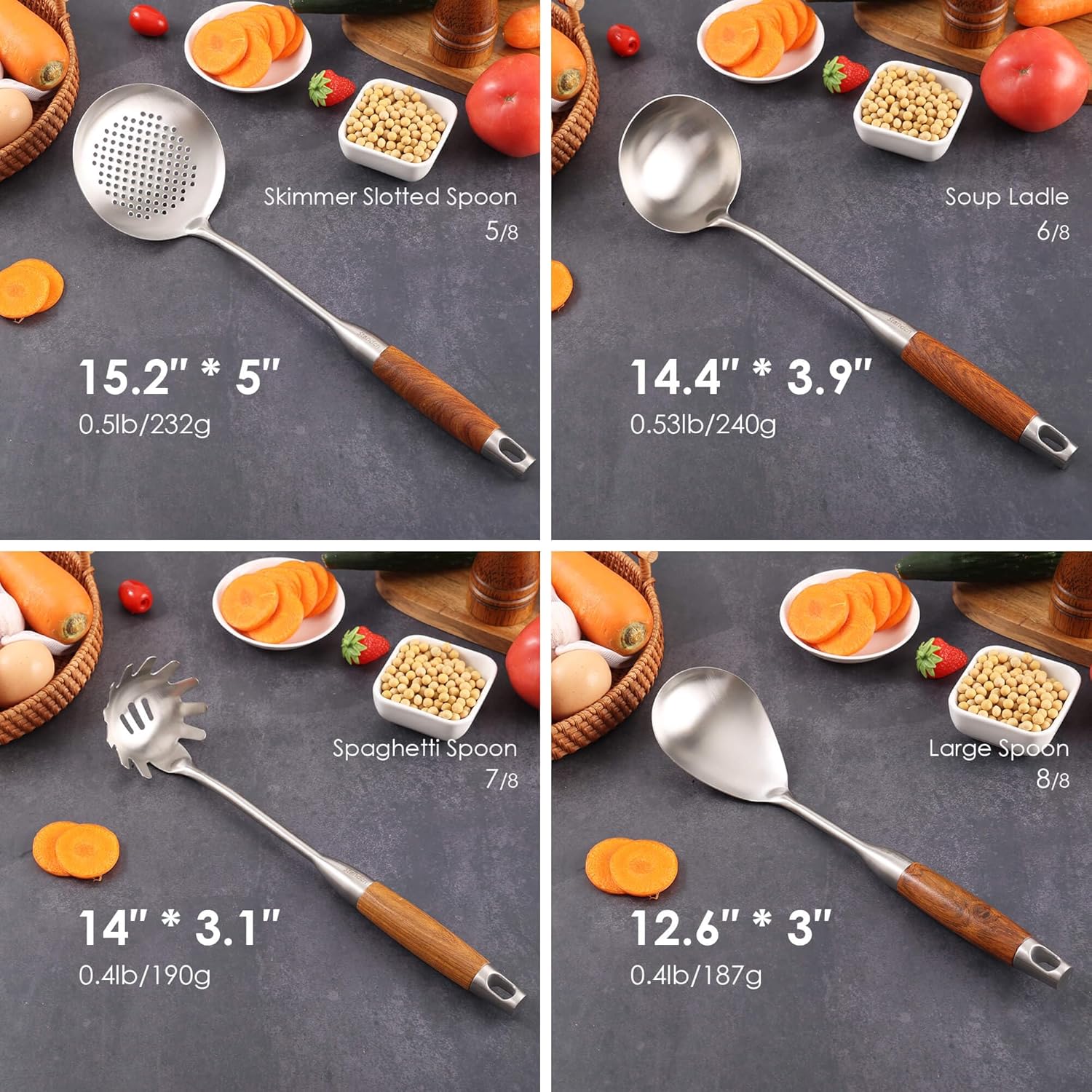 - 【15inch Long Cooking Utensils】: Ergonomic design, idea weight, excellent grip. The unique grain of the rosewood handle is exceptionally beautiful, silky to the touch, and offers high heat resistance, the 15-inch length ensures that the chef's hands stay cool during everyday domestic or commercial use