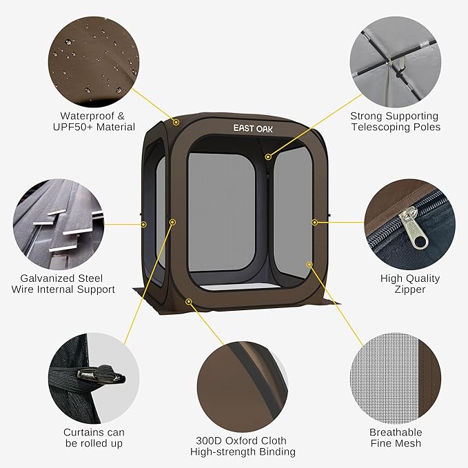 - ๐๐๐ด-๐ฃ๐ฟ๐ผ๐ผ๐ณ & ๐ฉ๐ฒ๐ป๐๐ถ๐น๐ฎ๐๐ฒ๐ฑ: The EAST OAK portable pop-up screen teent features a 4-sided B3 fine mesh design for 360ยฐ perfect ventilation to protect you from mosquitoes, bugs and anything the outdoors can throw at you. The tent body is made of high-quality Oxford fabric with anti-UV silver coating to achieve all-day UPF 50+ UV protection. Perfec for picnics, camping, and the beach