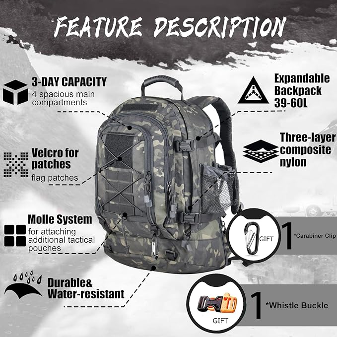 • ✅ Effective: There's plenty of compartments to store and organize your life. The pack holds 3 days worth of clothes along with toiletries and other essential gear. A solid multifunctional backpack for combat, range, survival or hunting. It is water resistant keeping everything dry in a storm.