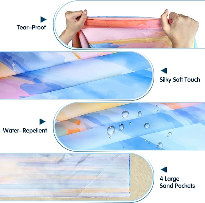 - [ Better Material, Skin-Friendly ] - Our beach blanket crafted from Cool Soft Fabric ensures comfortable lounging without skin irritation. Easily cleanable, simply brush off sand effortlessly! Constructed with sand-resistant, water-repellent, and odorless fabrics, eliminating the need for drying after a beach visit.