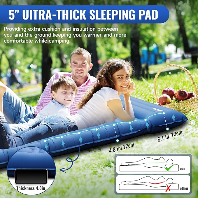 - 🏕️【5" Ultra-Thick Double Sleeping Pad】KASIMO double camping mattress pad could inflate to size 78" X 55" X5.1'', wider and thicker than others on the market. It could keep your body away from the uneven ground and hard rocks, ensuring maximum comfort, give you the newest experience