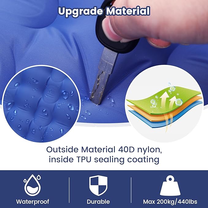 - 🌜Camping Grade Material🌛 KASIMO inflatable sleeping mat is made of tough 40D nylon, multi-layer waterproof and thick TPU coating, providing ultra pressure-bearing and durability which could supports 200lbs, no worry about air leaks or tears. Besides this camping mattress is easy to clean with a damp cloth
