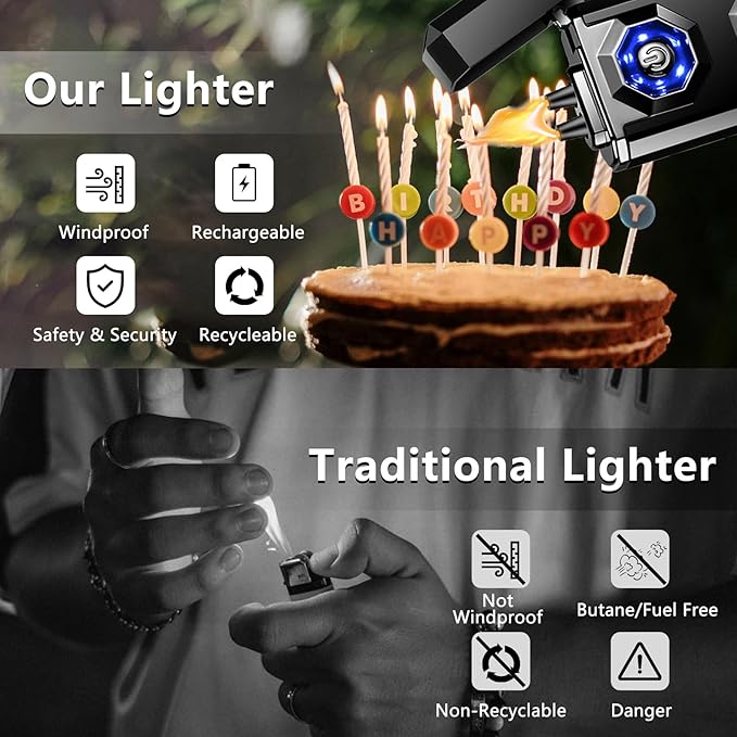 - 🔥[Well-Designed Appearance] - The arc lighter shell is made of zinc alloy through a dozen processes to make the torch lighter body strong and scratch-resistant and wear-resistant, and the innovative rhombic outline is carefully polished to make the electronic lighter feel smoother and more comfortable, and the LED lighting effect with the appearance of the cool lighter makes it more shining and dazzling.