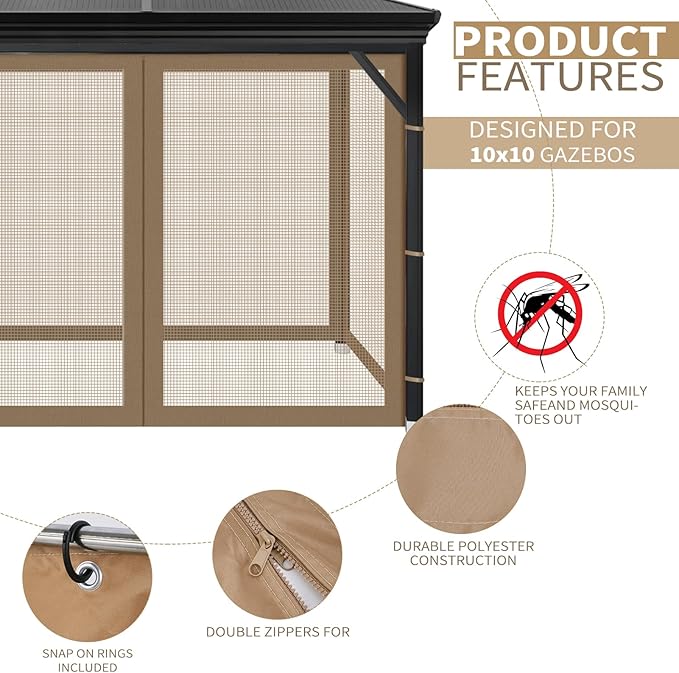 - Excellent Design: Double-sided zipper design on all 4 sides makes it easier for you to get in and out. We offer plastic hooks and loops for you to attach the mesh to the gazebo. Just zip it up, you can enjoy your courtyard view outside in the hot summer