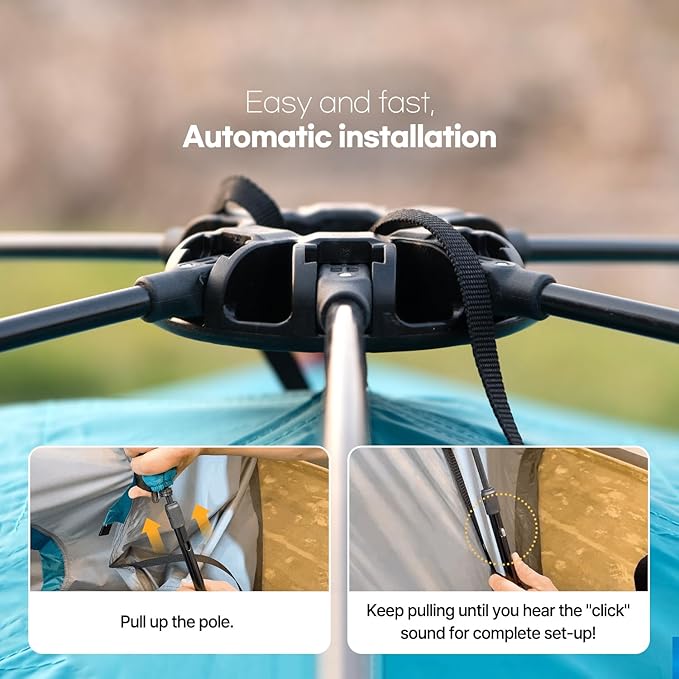 - ⏰【Quick Setup Automatic Tent】Unpack the 2 person tent, find a level surface, lay it flat, and unfold the four arms. Simply lift the tent's top, and it will automatically install itself. To ensure added stability, lock the top. This tent can stand on its own. Additionally, we provide stakes and windproof ropes for extra security. When your camping trip is over, simply press down on the two short poles at the top, and the tent will effortlessly fold itself.