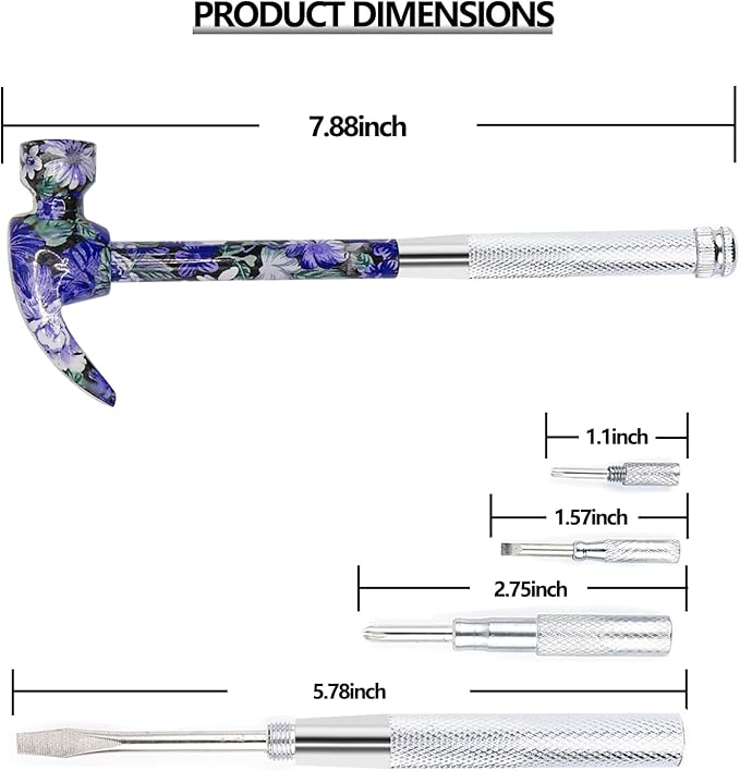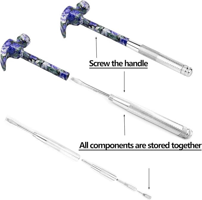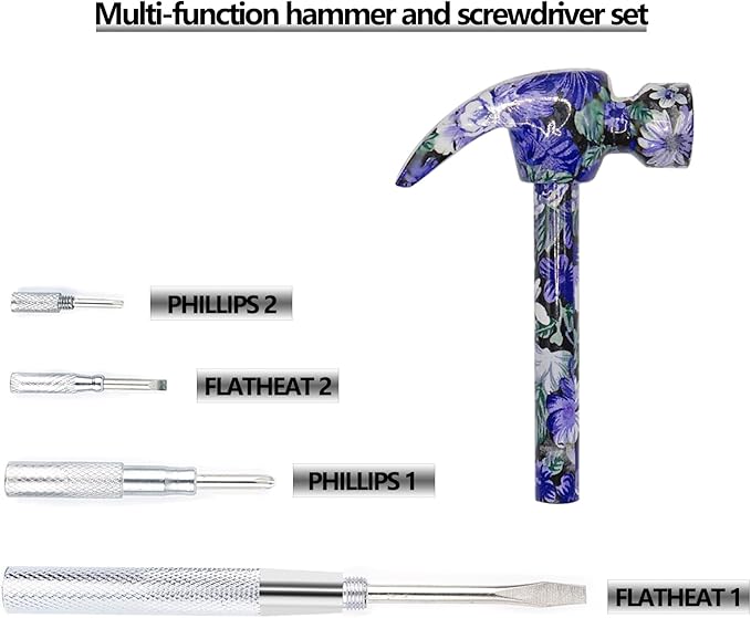 - Multi-hand tools: multi-purpose hammer and screwdriver set includes multi-function tool sets such as pattern metal hammer and screwdriver: , Phillips screwdriver×2, slotted/flat-head screwdriver×2, nail hammer ×1, claw hammer ×1. All the multi-tool hammer components are stored together to basically meet your various DIY chores.