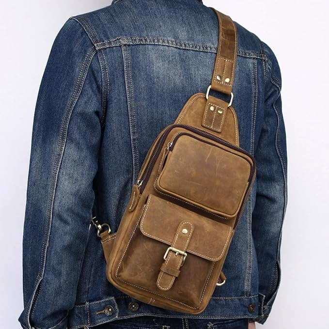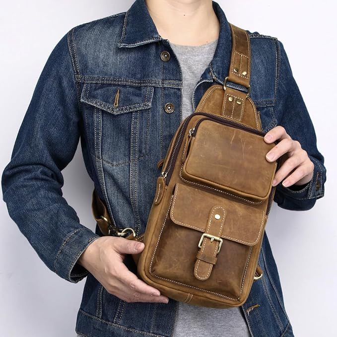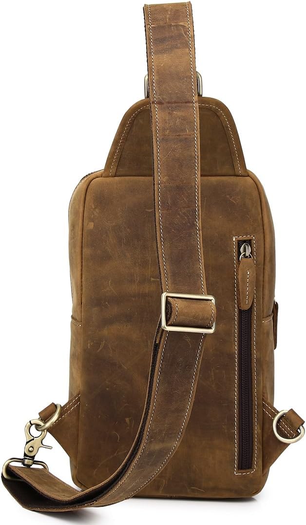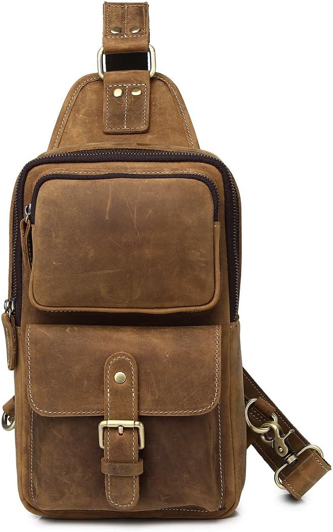 KPYWZER Sling Bag Men Women Vintage Full Grain Genuine Leather Shoulder Backpack Satchel Chest Casual Daypack Crossbody Outdoor Day Pack Backpacks Brown