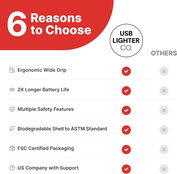 - ECO-FRIENDLY - The LT electric lighter eliminates the need to burn fuel, butane refills, or constantly throwing away disposables making them more eco-friendly. It’s also constructed with biodegradable ABS plastic components that are tested in accordance with ASTM D5511-18 standards.