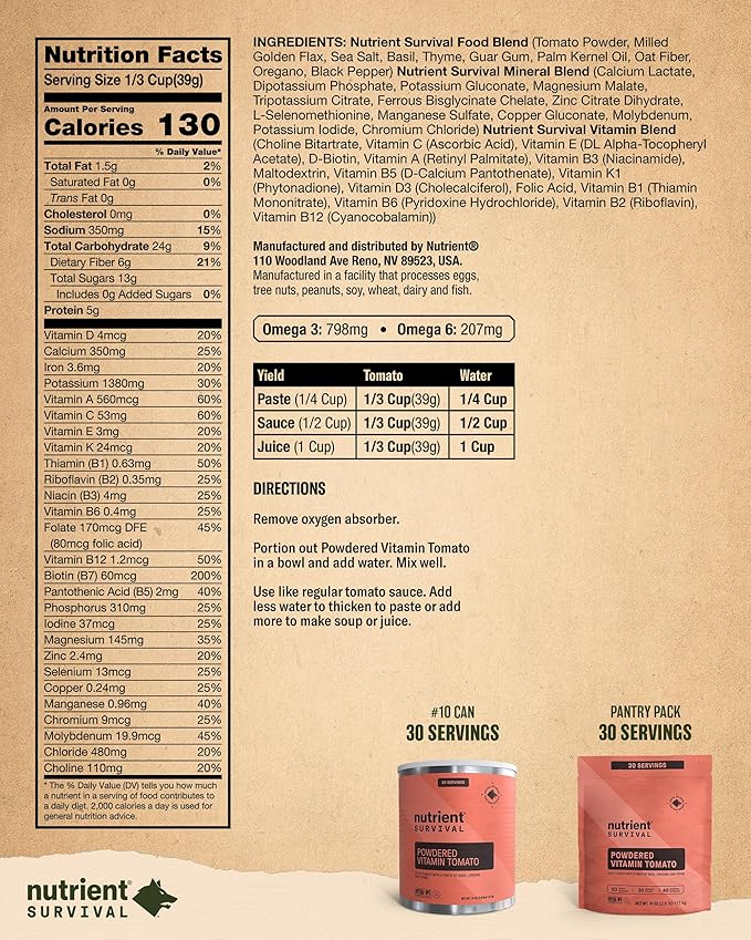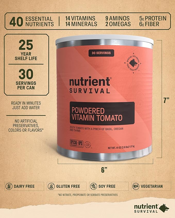 - FEED YOUR FREEDOM: Nutrient Survival Powdered Vitamin Tomato is an essential item to add to any emergency food supply. Rich in natural flavonoids and antioxidants including lycopene, just add water to make delicious tomato dishes from sauces to soups