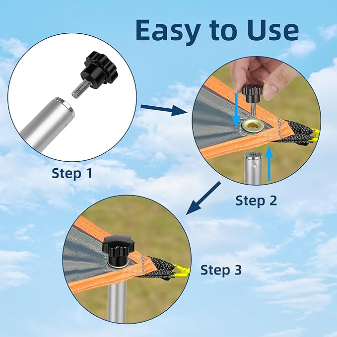 - Anti-slip and Torsion Design:The tent poles come with removable black flower shaped non-slip plastic heads on the front of the poles. Slide the non-slip head through the canopy grommets and screw the tent poles onto the plastic head by twisting so that the tent is held in place