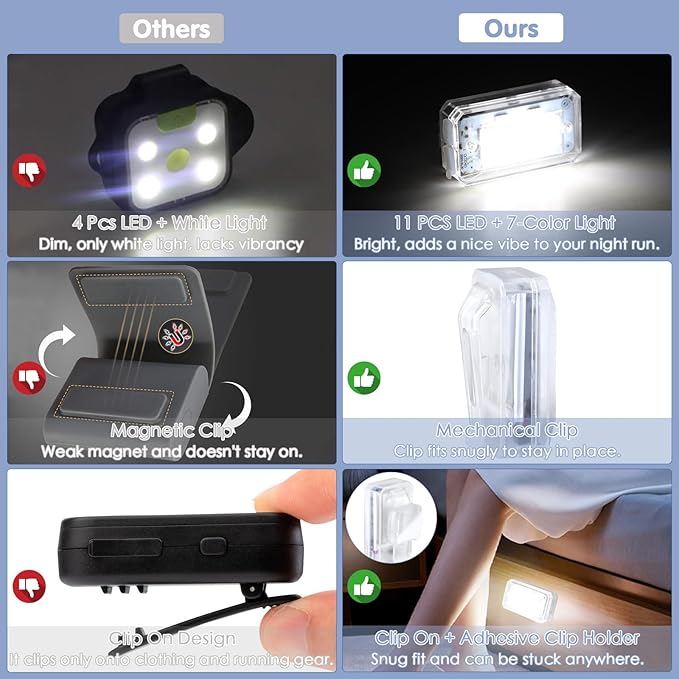 - Night Safety Light: Built-in 11 LED chips with 300 lumens of bright and soft light without blinding, our running lights for runners significantly enhances visibility in low-light conditions. This ensures that runners are noticed by pedestrians, cyclists, and drivers, thereby improving safety during nighttime outdoor activities.