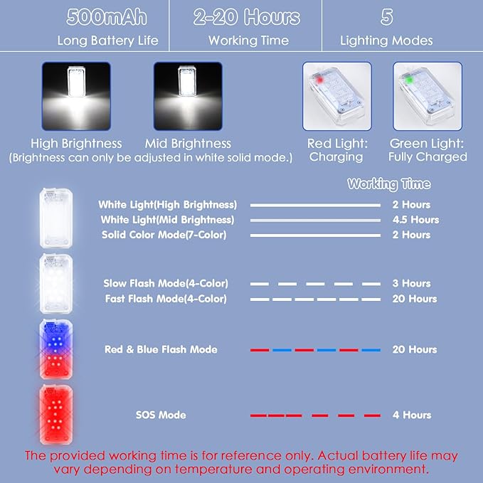 - Lots of Light Options & 500mAh Battery: 5 Light Modes: Solid Color / Fast Flash / Slow Flash / Red & Blue Flash / SOS Mode. Add a playful touch to your evening run and stand out in the dark with the 7-color running light for jogging. The running clip on flashlight has a battery life of 2-20 hours, depending on the mode. Flash mode lasts longer than solid mode, and white light can be dimmed to save battery power.