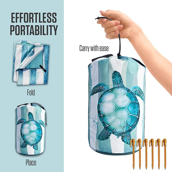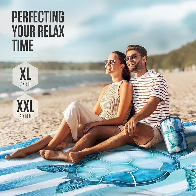 VENTURE 4TH Family-Size Beach Blanket: Sandproof, Waterproof, Lightweight & Compact. Includes Stakes and Carry Bag. 7x8 feet XL Striped Turtle
