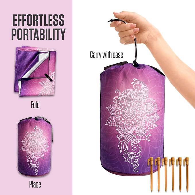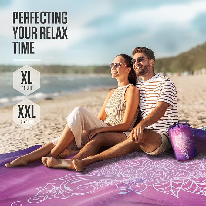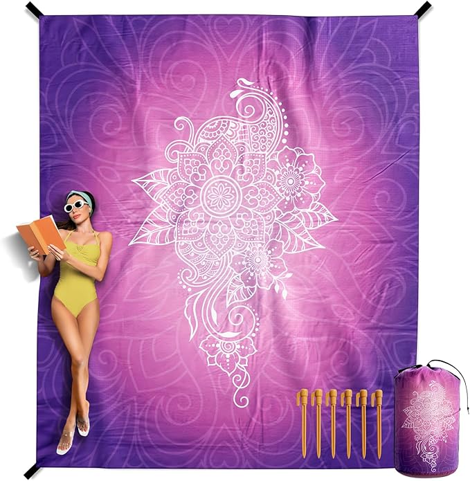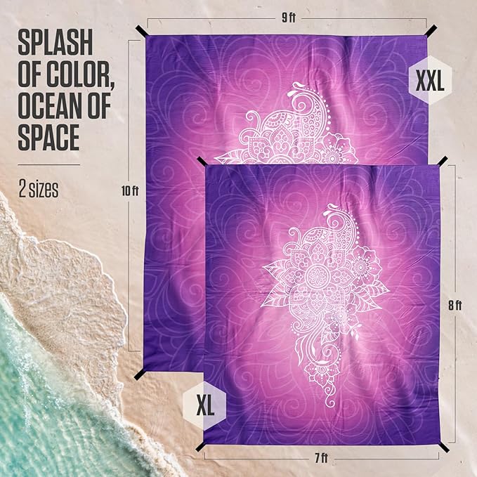 VENTURE 4TH Family-Size Beach Blanket: Sandproof, Waterproof, Lightweight & Compact. Includes Stakes and Carry Bag. 9x10 feet XXL Purple Mandala