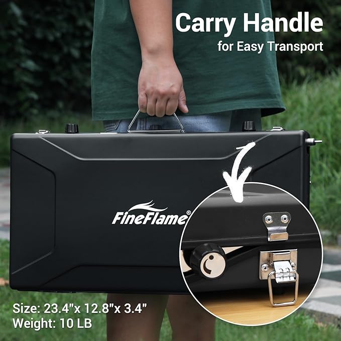 - PORTABLE: This 3-burner portable camping stove comes with a carry handle that allows you to carry it conveniently. It has a compact structure and weights only 9.9lbs which makes it even easier to carry it around. It can be taken along in a luggage or storage box, or even large tote bag, so carrying this portable propane camping stove is a breeze thing to do! Size: 23.4”x12.8”x3.4", Weight:9.9 LB