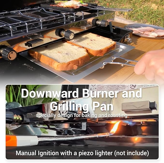 - ADJUSTABLE 2 BURNERS AND TOASTER : This camping stove is equipped with 3 independently adjustable knobs, two of Piezo ignition burners with 6,600 BTU power. The middle downward burner is designed for toasting, 7200BTU power and requires manual ignition. We recommend that you use a piezo lighter. It relies on heat radiation to heat and won't burn the toast