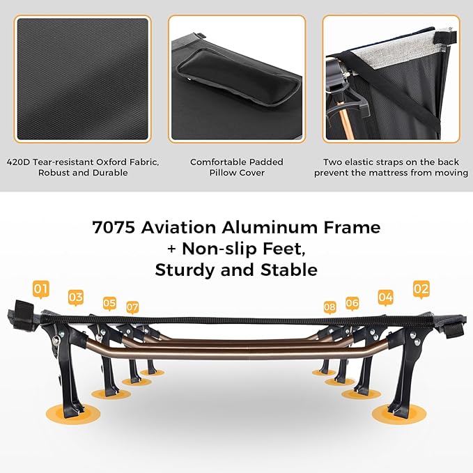 - 【Heavy-Duty & Long-Lasting】Made with 7075 aerospace-grade aluminum and tear-resistant cationic fabric,this heavy duty camping cot supports up to 265lbs.Oversized anti-slip feet add ground stability, while anodized coating protects the frame from rust and corrosion.