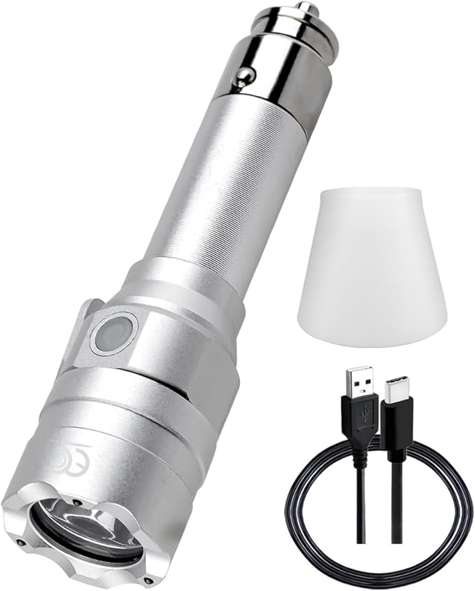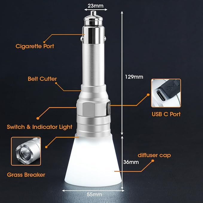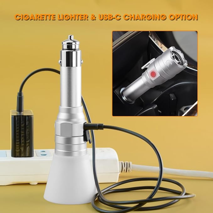 Small Flashlight Rechargeable with Diffuser 12 Volt Car Cigarette Lighter & USB C Charge for Auto Vehicles Emergency, Car Escape, Outdoors, Daily Use