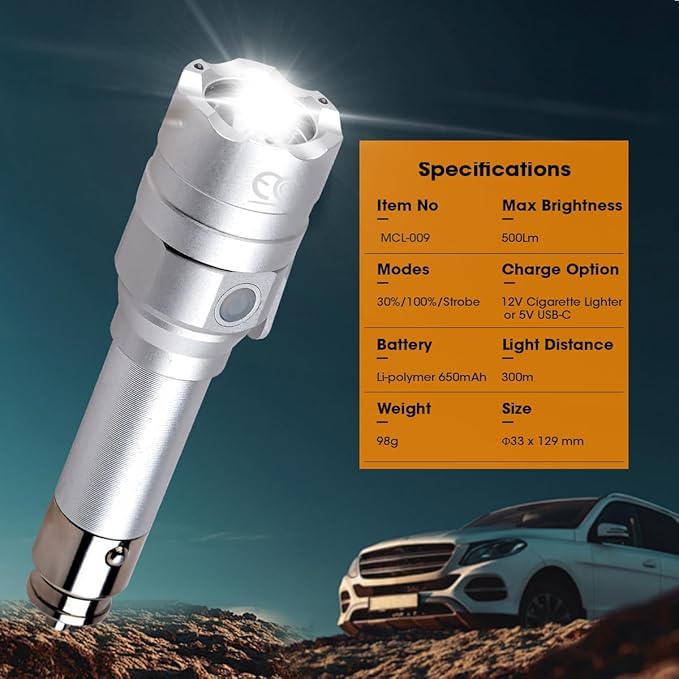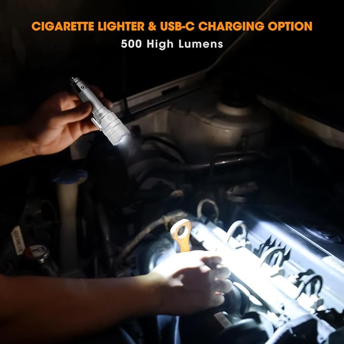 - [Easy Recharging in Car] Designed for auto conditions, it’s rechargeable via 12V cigarette lighter outlet or built-in USB C so never worry about running out of power with this LED flashlight.