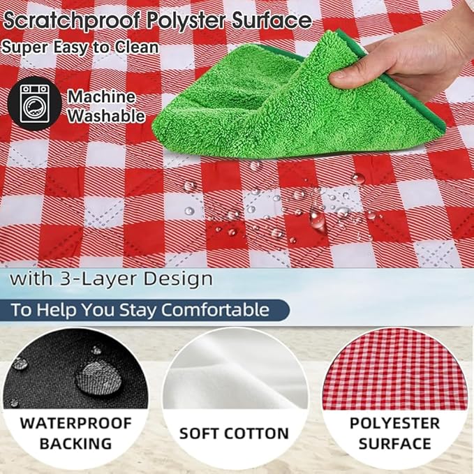 K Y KANGYUN XXL Large Beach Blanket (80 "x 79") Picnic Blankets fit 4-7 Adults, Waterproof Sandproof Beach Picnic Mat Foldable Rug with Family Outdoor Blanket for Camping Park Travel (Red Check)
