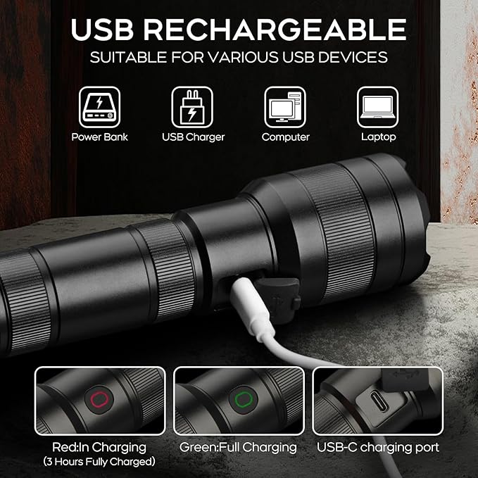 - 【Rechargeable Display】The flashlight supports charging. During the charging process, the indicator light will also be on, you can know when it is fully charged and unplug it in time, which will also help prolong the life of the high powered flashlight.
