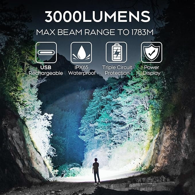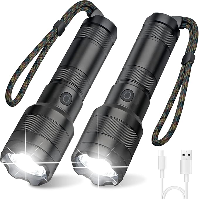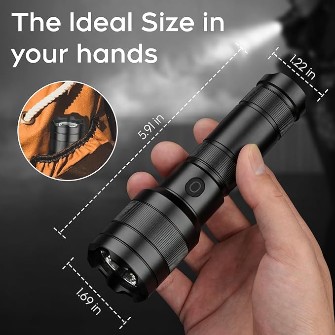 - 【High Lumens Flashlights】The super bright flashlight output power up to 1300 lumens and the service life is as high as 10000 hours. The rechargeable flashlight has a range of up to 1640 feet, making it easy to light up your back garden.