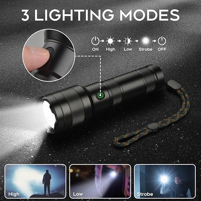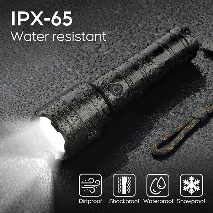 - 【IPX5 Waterproof】This rechargeable flashlight shell is made of advanced materials, and the back cover is sealed to maximize the waterproof function, so there is no need to worry about the short circuit caused by the water entering the flashlight in outdoor use. Our waterproof flashlight is the best choice for your outdoor flashlight, it is stress-free to use in rainy and snowy weather.