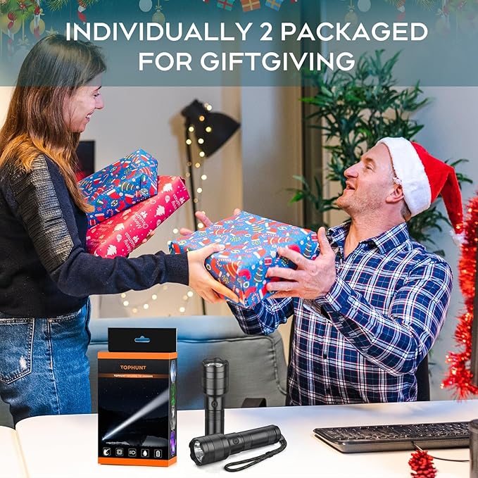 - 【Mini size & Anti-slip design】This TOPHUNT TH10 flash light is small enough to fit in your pocket, handbag, drawer, or car compartment. Also with flashlight holster, great flashlights for camping, hiking, dog walking, power outage, household using, emergencies, hurricane or survival.