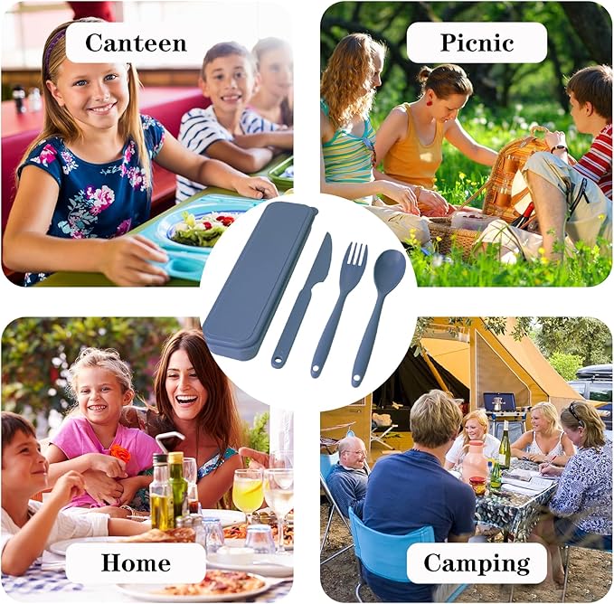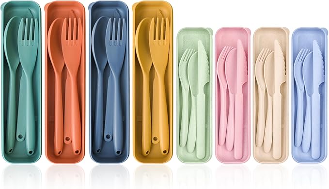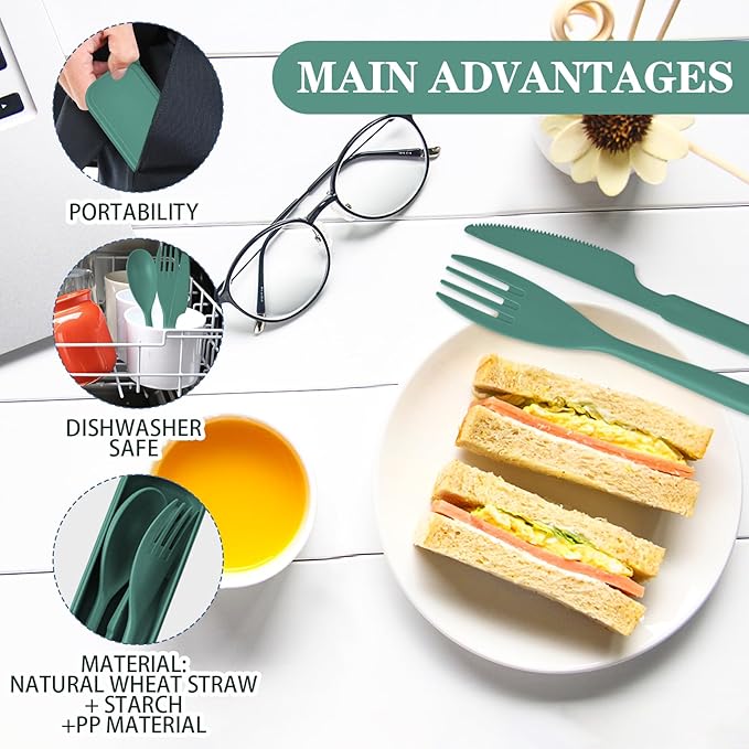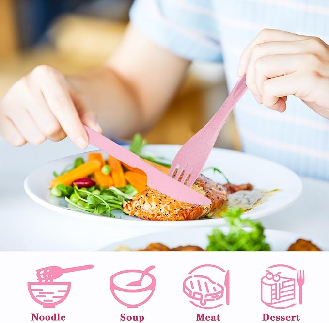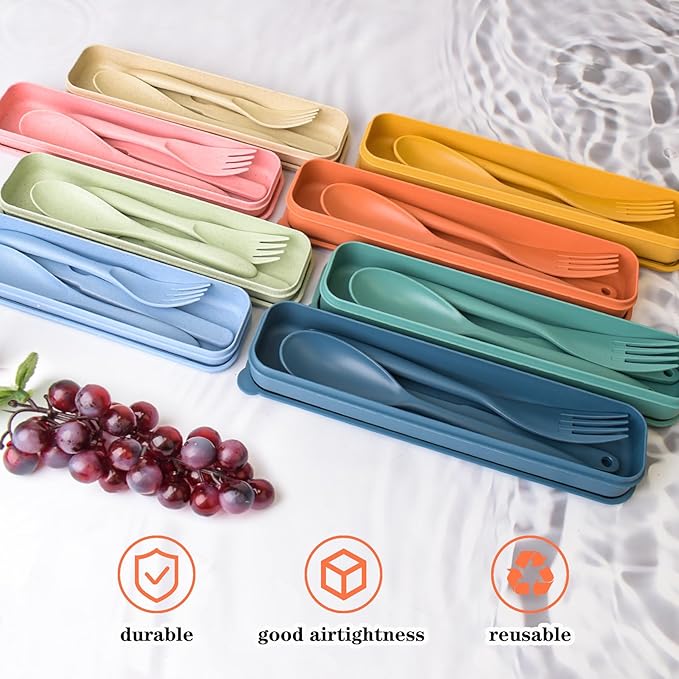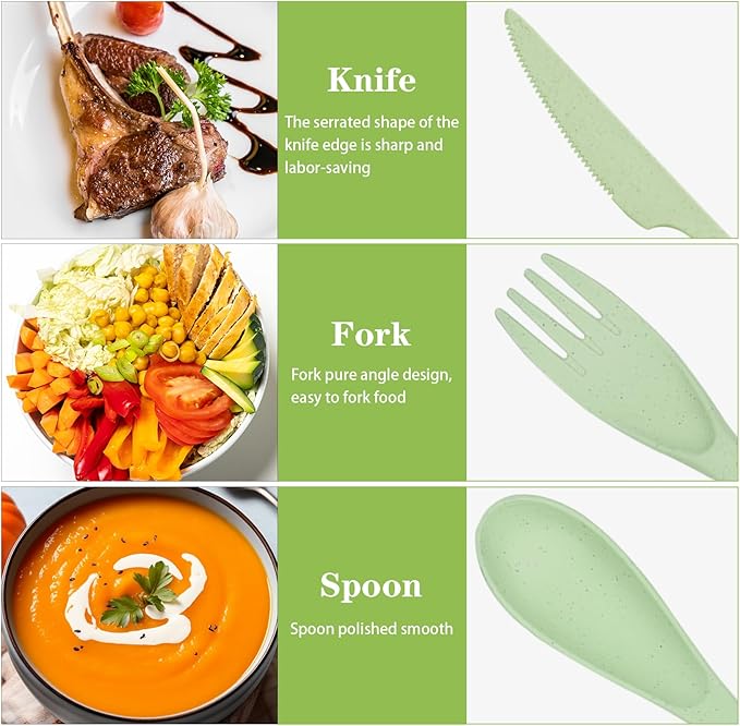 - 【Material and Portability】Our travel utensils are made of high quality plastic and reusable. Traditional stainless steel cutlery is too heavy and difficult to carry. Our flatware set is very lightweight.