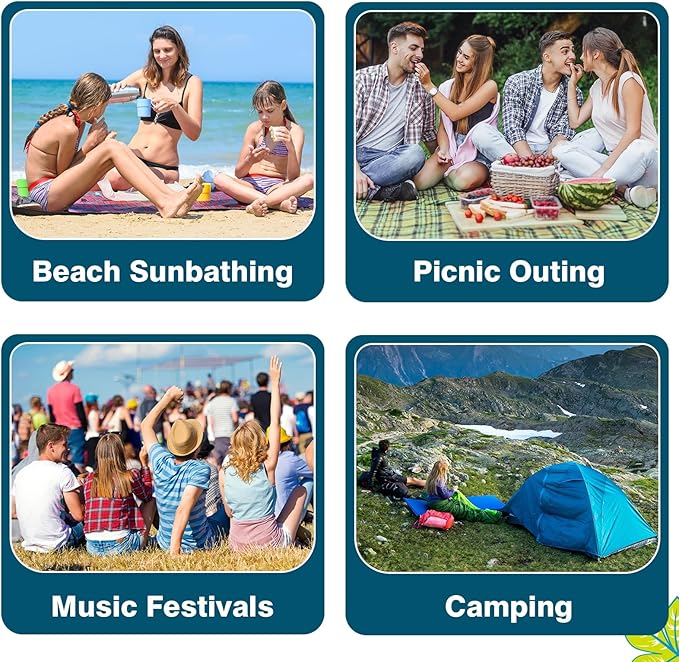 - MULTI-PURPOSE: The package includes 1 Beach Blanket, 4 Ground Stakes, 1 Metal Buckle and 1 Carry bag. Extra large picnic blanket is suitable for outdoor occasions such as beach sunbathing, picnic outing, music festivals, camping and etc.