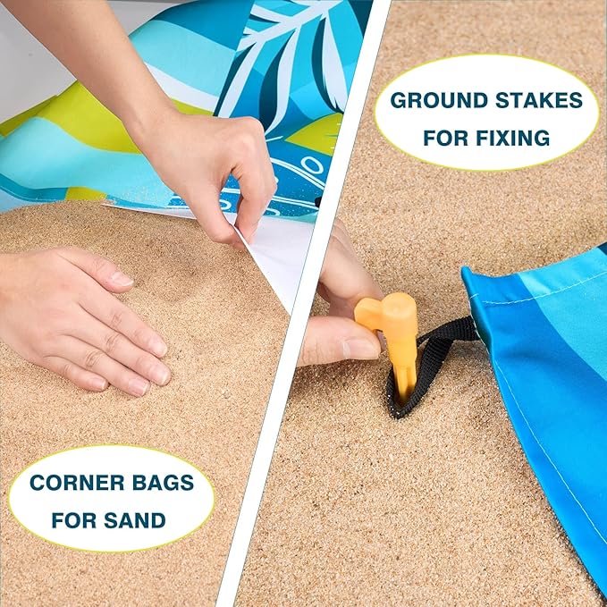 - EASY TO USE & STORE: Simply use ground stakes and 4 corner pockets with sand to hold the blanket in place, which can be inserted deeper into the beach or soil. The beach blanket weighs only 0.4kg, it can be folded very small and easily to carry. After use, you can store it in the storage bag we provide.