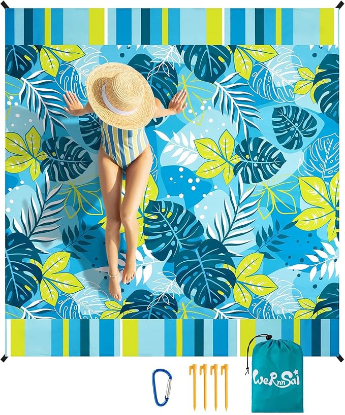 WERNNSAI Beach Blanket Waterproof Sandproof - Extra Large Beach Mat 79" x 83" Sand Free with 4 Stakes Pockets Quick Dry Lightweight Blue Plant Pattern Picnic Mat for Beach Party Camping
