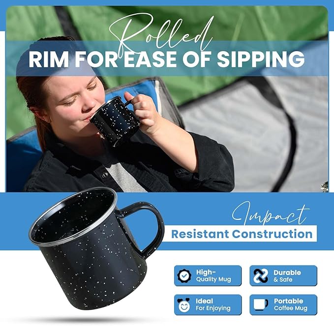 - 12-CUP CAPACITY WITH ENAMEL MUGS INCLUDED: This percolator has a generous 12-cup capacity to serve groups or individuals. The set includes two matching enamel cups, perfect for sharing a fresh brew by the campfire or at the kitchen table.c