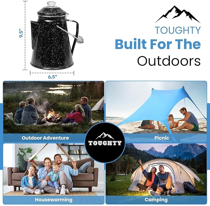 - VERSATILE, NON-ELECTRIC, AND EASY TO CLEAN: Suitable for use on an open fire, gas, or electric stovetops, the Toughty percolator offers versatility for any brewing setup. Dishwasher-safe and non-electric, it ensures easy cleanup and hassle-free brewing wherever you are.