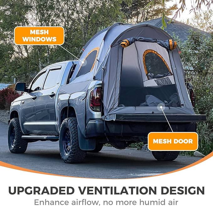 - Upgraded Ventilation: This tent for pickup truck is designed with 1 large entrance door, 2 big side mesh windows, all double-layered for optimal ventilation. The large mesh windows enhance airflow, keeping the inside temperature regulated and comfortable.