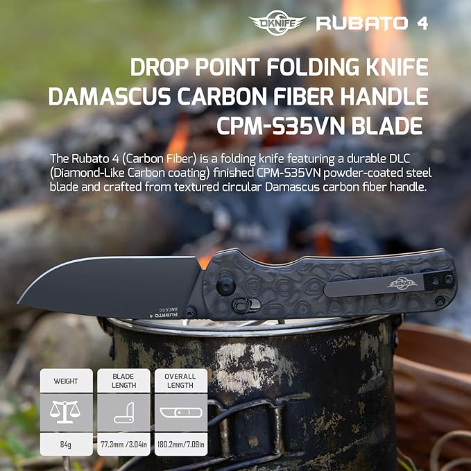 OKNIFE Rubato 4 Folding Knife, CPM-S35VN Steel, 3.04" Blade Damascus Carbon Fiber Handle with Titanium Pocket Clip, Drop Point, Rail Lock, Thumb Stud