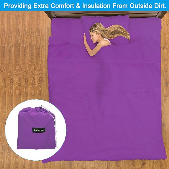 - Application: Our sleeping bag liner is an essential accessory for any camping or travel enthusiast. It is used as a lining for sleeping bags, providing extra comfort and insulation from outside dirt. Widely used in camping, traveling, hotel, train, etc. or as a replacement for bed covers at home.